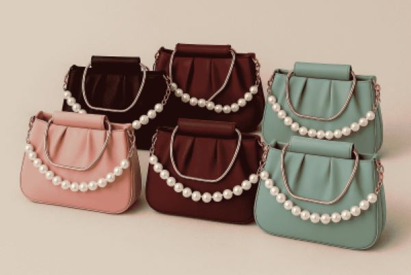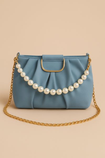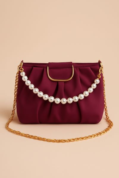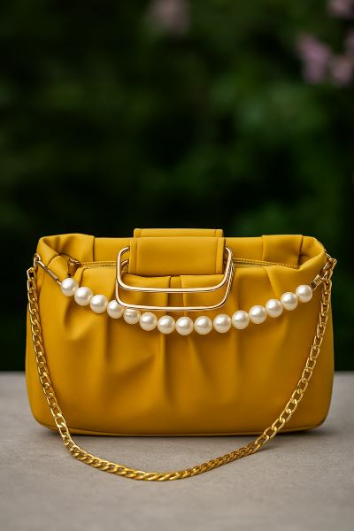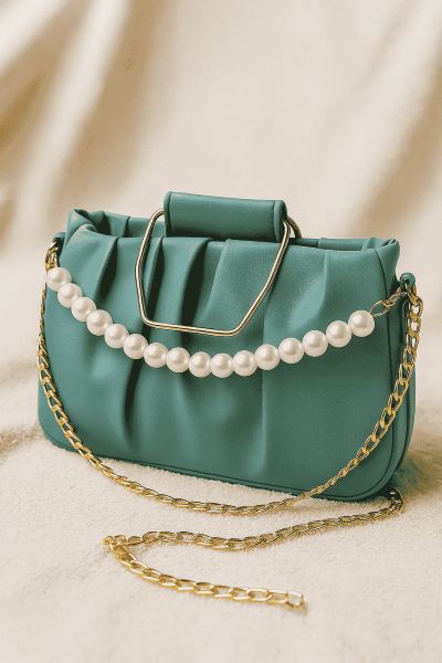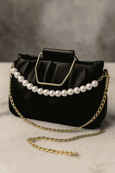 Step into timeless sophistication with this chic black handbag, designed to turn heads wherever you go. Crafted from smooth, pleated leatherette, it features a striking pearl accent and a luxurious golden chain strap for versatile styling. Whether carried by the sleek geometric handle or worn crossbody, this bag perfectly balances classic charm with modern glamour. Ideal for evening outings, parties, or elevating your everyday look.